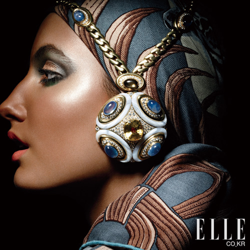 6 벨로와 펠트 모자, 350달러. ALBERTUS SWANEPOEL. 아프리카 풍의 가면 모양으로 디자인된 반지와 브레이슬릿, 가격 미정, LYDIA COURTEILLE CREATIONS. 다이아몬드 파베 세팅으로 디자인된 골드 뱅글들, 1000달러~1795달러, DAVID YURMAN. 플래티넘에 다이아몬드 세팅된 네크리스. 에메랄드 장식을 더해 아름답다. 가격 미정, CARTIER. 가오리 가죽 클러치백, 1650달러, GIORGIO ARMANI.