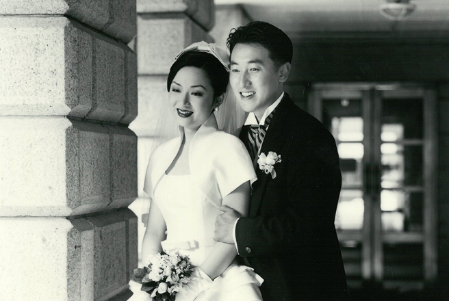 결혼식도 특별하게 했을 것 같아요 (윤) 당시 5성급 호텔 결혼식이 불법이었어요. 지금은 임피리얼 팰리스 서울인 아미가 호텔이 5성급이 아니어서 거기서 했죠. 둘 다 미국에서 생활하다 잠깐 들어와 결혼식만 올린 거라 많은 준비를 하진 못했어요. 그나마 미국에서 파티 같은 결혼식을 많이 봤던 터라 당시엔 파격적이었던 저녁 예식을 진행했죠. (김) 영국식 모닝 코트를 거의 처음으로 입었을 거예요. 아내는 뉴욕에서 직접 드레스를 사서 가져왔고요. 예식과 식사를 같이 하는 것도 새로울 때였어요. 웨딩 앨범도 처음 도입돼 청담동에 사진문화원이란 곳이 ‘핫’했죠. 신랑신부 헤어 메이크업을 명동 헤어 뉴스에서 했는 걸요.