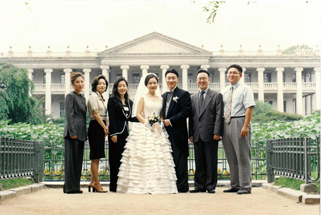 1996 7월 4일 당시 웨딩 앨범 제작이 처음으로 도입된 때 꼭 거쳐야 하는 코스였던 덕수궁 석조전에서 어색하게 사진 촬영을 했다. 웨딩 드레스는 크라인펠드 (kleinfeld)라는 유서 깊은 웨딩 편집 숍에서 구입한 드레스와 볼레로로 구성된 이탈리아 디자이너 제품.