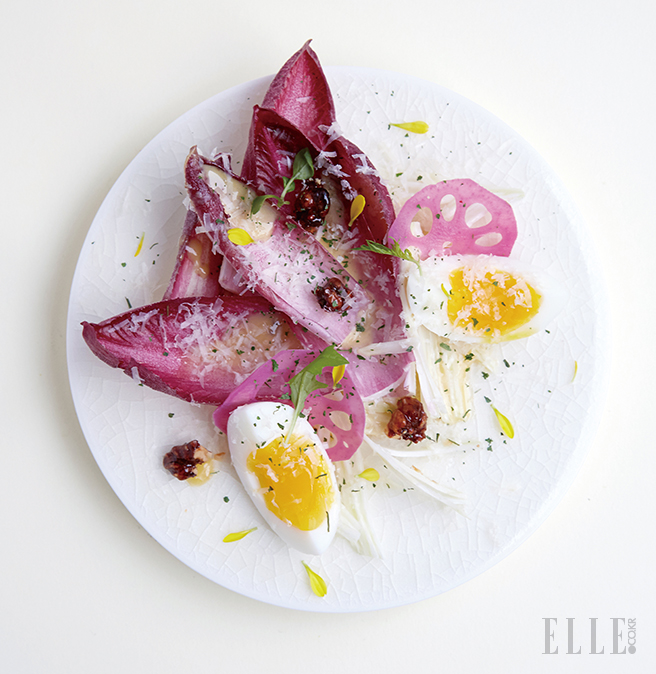 만드는 법 1 엔다이브와 펜넬(Fennel; ‘고기의 허브’라 불리는 미나리과 다년초)은 찬물에 담갔다 물기를 제거해 다듬는다. 2 연근 피클은 얇게 썬다. 3 달걀은 노른자가 굳어지지 않을 정도로만 익혀 껍질을 깐다(달걀을 팬에 넣고 중불에 끓이다 물이 끓기 시작하면 불을 끄고 7분 후 찬물에 넣어 식힌다). 4 호두를 설탕 시럽에 절인 뒤 180℃로 예열한 기름에 튀긴다. 5 잘게 다진 안초비에 달걀노른자를 넣고 포도씨유를 조금씩 넣어주면서 디종 머스터드, 레몬주스를 섞어 안초비 머스터드 소스를 만든다. 6 접시에 엔다이브, 펜넬, 연근 피클, 달걀을 보기 좋게 장식한 뒤 안초비 머스터드 소스를 뿌리고 호두와 국화 꽃잎을 올리면 완성. 파르미지아노 레지아노를 가볍게 뿌려도 좋다.