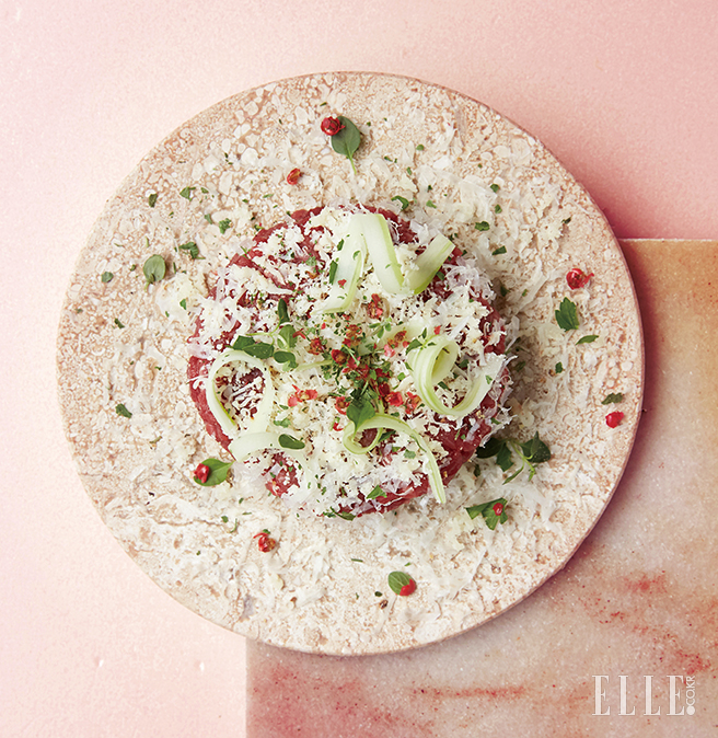 만드는 법 1 쇠고기는 썰기 15분 전에 냉동실에 넣어 놓았다 꺼낸다. 식감이 느껴질 정도로 잘게 썬다. 2 오이 피클, 샬럿은 잘게 다진다. 3 볼에 잘게 썬 쇠고기와 오이 피클, 샬럿을 한데 넣고 레드 와인 비네거, 소금, 설탕, 디종 머스터드와 잘 섞는다. 4 앞서 양념한 쇠고기를 접시에 올리고 스모크 체더 치즈를 갈아서 위에 듬뿍 얹는다. 5 얇게 밀어 모양을 낸 셀러리, 레드 페퍼, 타임, 파슬리를 장식해 내면 완성.