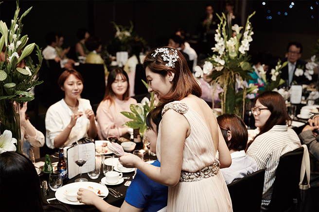 뜨거운 연애가 권태로워질 때쯤 반려동물 칸(사모예드종 세 살)과 가족이 되면서 자연스럽게 동거를 시작하게 됐다. 처음에는 물론 딸을 둔 세상의 많은 이들처럼 부모님의 완강한 반대가 있었지만 밤마다 칸을 보려고 몰래 나가는 내 모습을 보고 서서히 포기하신 것 같았다. 그렇게 양가 부모들의 성화 속에 사귀는 7년 동안 두 차례나 공식적인 상견례를 했음에도 각자 일에 몰두해야 하는 타이밍이 너무 달랐고 서로를 배려하는 마음에서 결혼을 서두르진 않았다. 게다가 행복하고 만족스러운 동거 생활을 하고 있었기에 결혼에 대한 갈망이 더 없었던 것 같다. 그러던 중 올 초 양가 부모들이 나서서 우리 사주를 풀어 결혼식 날짜를 잡아왔다. 7월 31일, 둘의 기가 너무 세 남들이 하지 않은 날을 골라온 날짜가 운명의 날이 된 것이다. 그때부터 고민이 시작됐다. 우리에겐 어떤 결혼식이 어울릴까? 많은 생각들이 오가는 중에 꼭 하나 이루고 싶은 것이 있었다. 바로 오랫동안 동거해 온 딸을 이해해 준 부모님을 기쁘게 해 드리는 결혼식을 해야겠다고 결심한 것이다. 하지만 곧 부모님과 얘기를 나눈 후 이런 결심은 위태로워지기 시작했다. 부모님이 원하는 결혼식과 내가 원하는 결혼식이 너무 달랐다. 동시 예식을 원하는 우리와 달리 부모님은 멀리서 오는 손님들을 위해 음식은 뷔페로 하고 싶어 했고 원하지 않는 식순은 제외하고 싶었지만 어릴 적부터 이바지 음식 회사를 운영하던 어머니는 폐백을 직접 만들고 꼭 진행해야겠다니 도저히 합의점을 찾을 수 없었다. 한 번뿐인 결혼식인 만큼 평소 친구들과 지인들을 초대하고 싶은 컨셉트가 있는데 어떡하지? 고민 끝에 두 번의 결혼식을 하기로 결정했다. 우리 둘과 부모님이 만족할 수 있는 완전히 다른 형태의 결혼식 말이다. 그때부터 온종일 예식을 할 수 있으며 뷔페와 코스 요리가 가능한 장소를 물색하기 시작했다. 여의도 글래드 호텔로부터 원하는 모든 조건이 가능하다는 연락을 받고 주저 없이 확정. 장소를 정한 뒤 바로 웨딩 컨설팅 컴퍼니 제인마치를 찾아가 전체적인 예식 컨셉트와 드레스, 헤어 &메이크업을 의뢰했다. 웨딩 테마는 ‘서머웨딩’. 블랙이 베이스인 호텔 상황에 맞춰 포인트 컬러를 화이트와 그린으로 정한 뒤 그에 어울리는 예복을 찾아 40벌이 넘는 드레스를 입어보며 최종적으로 선택을 마쳤다. 두 번의 결혼식이 좋은 이유는 바로 본식 드레스도 두 벌을 고를 수 있다는 점. 웨딩드레스 로망에 젖어 행복한 고민에 빠져 있을 때, 예상하지 못한 소식이 들려왔다. 혼.전.임.신. 결혼식을 두 달 앞둔 시점에 임신 초기임을 알게 됐고 그때부터 많은 것을 포기할 수밖에 없었다. 10kg 감량이 목표였던 다이어트부터 이미 몇 회씩 끊어놓은 마사지와 에스테틱 등 준비해 온 것들을 하지 못한다고 생각하니 속상한 마음이 앞섰다. 특히 헤어 염색. 밝게 염색한 머리를 결혼식 바로 전까지 염색하기 위해 버티고 있었는데(결국 투 톤 헤어스타일을 하고 식장에 들어갈 수밖에 었었다). 심지어 아기를 위해 좋은 음식들을 이것저것 챙겨 먹다 보니 체중 유지는커녕 살이 쪄서 결혼식 하루 전날에 드레스를 바꾸는 해프닝이 벌어졌다. 처음에는 이 모든 것들이 당황스럽고 속상했지만 결국 개인적인 문제이며 내가 마음먹기에 달렸다는 걸 깨닫는 데 그리 오랜 시간이 걸리진 않았다. 양가 부모님들과 지인들의 축하를 받다 보니 결혼식에서 바랐던 많은 걸 내려놓을 수 있는 마음의 여유가 생겼고 소중한 아기를 위해 행복하게 생각하기로 다짐했다. 두 번에 걸쳐 진행된 예식은 1부는 양가 친척들과 부모님들의 지인들을 위해 최대한 예의 바르고 정중한 분위기 속에 치러졌고 축가도 어른들이 좋아할 만한 트로트 가수를 섭외했다. 엄마가 직접 만든 폐백 음식을 많은 사람들에게 선보일 수 있도록 식장 무대 위에서 공개 폐백을 했는데 부모님 지인들이 가장 좋아했다. 반면 2부는 친구들과 우리 지인들을 초대해 편안하고 즐겁게 진행했다. 무거운 주례사 대신 우리를 가장 잘 아는 지인에게 사회, 주례, 축가를 맡겼는데 결혼식 축하 메시지를 SNS에 올릴 때는 뚱뚱한 신부의 상황을 이해할 수 있도록 #혼전임신이라는 해시 태그를 달아달라고 하는 바람에 지인들의 타임라인에는 #혼전임신이라는 태그가 달린 사진이 도배가 되는 해프닝도 있었다. 하객들에게 줄 선물로는 로또 1등이 3번이나 나온 로또 명당을 찾아가 350장의 로또를 산 후 정성스럽게 비닐 포장을 했다. 결혼식에 와준 모든 이들이 1주일만이라도 희망의 마음을 가지면 좋을 것 같았다. 이렇게 탈 많았던 결혼식을 끝낸 소감은? 주변에 이미 결혼한 사람들의 ‘허무하다, 다시 한 번 더 결혼식을 하고 싶다’는 말을 많이 듣곤 했는데 나는 전혀. 두 번의 결혼식으로 몸은 조금 힘들었지만 후회 없이 행복한 결혼식을 했다는 것이 너무나 만족스러웠다. 만약 예식의 주체가 두 사람이 아닌 부모님에게 치우치거나 혹은 다른 사람들을 배려하기 위해 원하지 않는 방향으로 흘러간다면? 그럴 땐 우리처럼 과감하게 두 번의 결혼식을 하는 건 어떨는지.