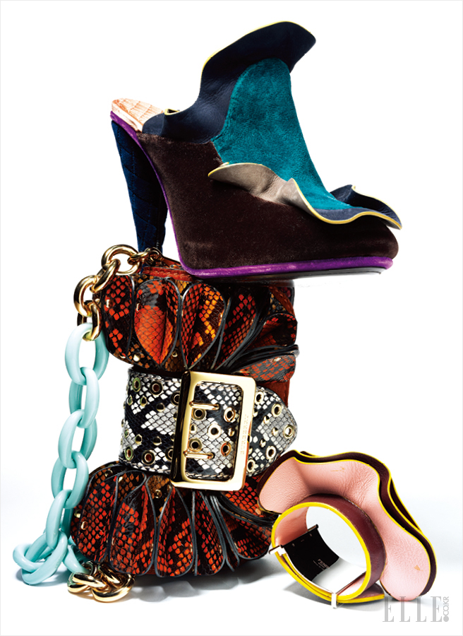 레더 웨이브의 벨벳 뮬은 1백32만원, Fendi. 뱀피와 러플 디테일의 미니 숄더백은 가격 미정, Burberry. 러플 브레이슬렛은 75만원, Fendi.