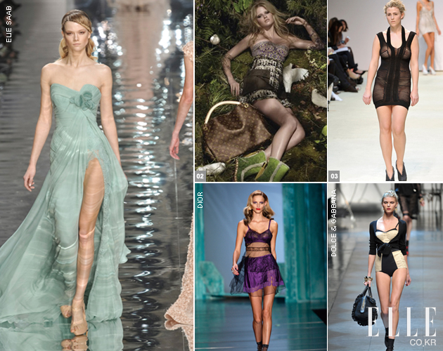 런던에서 컬렉션을 여는 디자이너 마크 페스트는 빅 사이즈의 모델들을 기용하는 디자이너로 유명하다. 그는 통통한 몸매를 가진 몇 명의 모델들을 스키니한 몸매의 모델들과 한 무대에 세운다. 라이크라 소재의 그의 옷이 어떤 체형에나 잘 어울린다는 것을 보여주기 위한 것이라고 하는데, 런던 컬렉션 취재를 마치고 돌아온 에디터는 의외의 말을 던졌다. “마크 페스트의 쇼를 보고 정말 놀랐어. 왜냐고? 통통한 모델과 날씬한 모델이 번갈아 나오는데 통통한 모델이 훨씬 더 예뻐 보이더라고. 라이크라로 만든 니트웨어를 마른 애들이 입으니까 어딘가 모르게 초라해 보였어. 통통한 모델이 입었을 때 직선적인 디테일이 몸의 굴곡을 따라 부드러운 곡선을 만드는데, 그게 훨씬 섹시하고 건강해 보였지.” 그렇다. 분명한 사실은 체형에 따라 어울리는 룩이 따로 있다는 것이다. 그리고 이번 시즌에는 커비한 몸을 가진 이들이 두 손을 들고 환영할 만한 빅 트렌드들이 여럿 존재한다. 그 중심에는 란제리 룩으로 대표되는 뉴 로맨티시즘이 있다. 코르셋과 레이스 톱, 뷔스티에 등은 가슴에 껌딱지 두 개 붙어 있는 마른 몸매의 소유자는 절대로 소화할 수 없는 아이템이다. 돌체 앤 가바나가 표현한 섹시한 이탈리안 아가씨 룩, 그리고 프리다 지아니니가 구찌 쇼에서 선보인 과감한 슬릿 장식의 저지 미니드레스, 그리고 랑방의 너울거리는 랩 드레스 역시 커다란 곡선들이 모여 만든 커비한 몸매를 위한 것이다. 하지만 오해하진 마시길. 이것은 온몸에 덕지덕지 붙은 군살을 방치해도 좋다는, 희망의 메시지가 아니다. 이건 어디까지나 체형에 관한 이야기다. 본래 커비한 체형을 가진 이들과 직선적인 몸을 가진 이들이 가야 할 길이 다르다는 이야기다. 절친한 친구인 케이트 모스와 베스 디토가 전혀 다른 룩을 선보이는 것처럼 말이다.