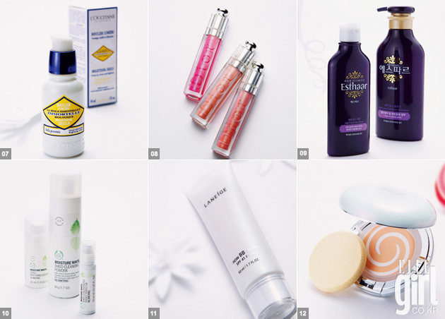 10 thebodyshop 'moisture white shiso serum, cleansing powder,concentrate target perfecter' 질감★★★사용감★★ 마무리감★★ 초기 멜라닌 형성을 예방하는 자연 추출물이 주근깨와 피부 잡티를 효과적으로 완화시키는 화이트닝 라인이다. 물에 섞어 사용하는 클렌징 파우더는 거품이 풍성하게 생겨 민감한 피부도 부담 없이 사용할 수 있으며 메이크업을 말끔하게 제거해주는 아이템! 세럼과 타깃 퍼펙터는 발림감은 좋으나 약간의 끈적거림이 남는 것이 단점. 30ml.4만7천원. 50ml. 2만6천원. 10ml. 3만9천원. HYUN JOO