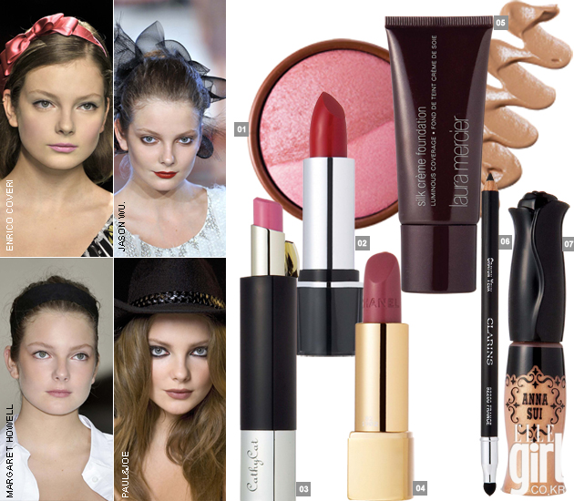 1 치크 컬러 듀오 1호. 5g. 2만8천원. 스틸라. 2 칼라 인트리그 립스틱 1호. 4g. 3만원. 엘리자베스 아덴. 3 루쥬 알뤼르 82호. 3.5g. 3만9천원. 샤넬. 4 터치업 립스틱 111호. 4.5g. 2만2천원. 캐시캣. 5 실크 크림 파운데이션 로즈 아이보리. 35ml. 6만원. 로라 메르시에. 6 아이펜슬 1호. 1.2g. 2만4천원. 클라란스. 7 리퀴드 아이칼라 800호. 5.2ml. 2만6천원. 안나 수이.