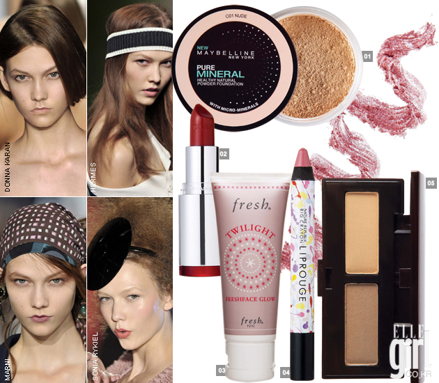 1 올인원 미네랄 파우더 21호. 8g. 2만2천원. 메이블린. 2 졸리 루즈 729호. 3.5g. 3만3천원. 클라란스. 3 트와일라이트 프레쉬페이스 글로우. 30ml. 6만6천원. 프레쉬. 4 빅크레용 립 루즈 1호. 4g. 6천6백원. 네이처리퍼블릭. 5 브로우 파우더 듀오. 3.4g. 3만5천원. 로라 메르시에.