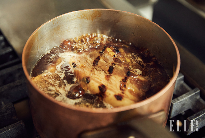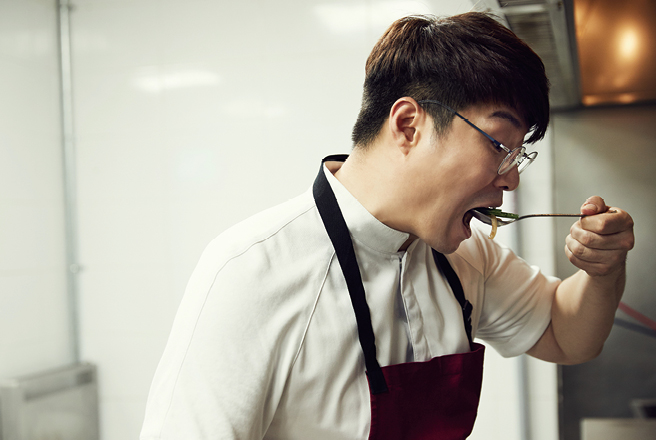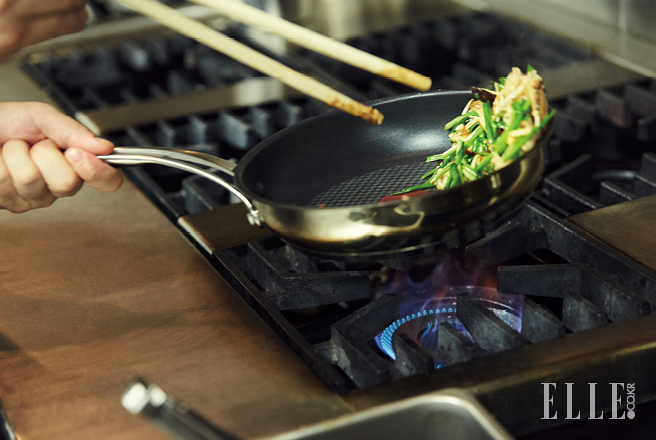 게다가 그가 소울 푸드로 꼽은 음식은 ‘타이 칠리 소스를 곁들인 돼지고기’. “방이동에 김후남 셰프님이 운영하는 스타쉐프 바이 후남 아시죠? 그분이 제 사부예요. 제가 1999년인가 까마득한 후배일 때 어깨너머로 배운 거라 그냥 제 스타일의 레서피예요. 처음 먹어봤을 때 돼지고기 위에 이런 아시아풍의 소스를 얹는다는 것도 신선했죠. 갖가지 채소가 들어가고, 게다가 고수를 이렇게 먹으면 거부감이 없다는 것도 놀라웠어요.” 사부로부터 영감을 받은 요리를 택한 이유는 당시의 맛있는 충격을 재현해 보고 싶어서다. 막상 요리를 시작하니 15분만에 ‘휘리릭’ 완성. 시간 제한을 준 것도 아닌데, 과정은 빠르고 심플하다. “쉽죠? 어렵게 할 필요 없어요. 요리는 재미있게 해야 돼요. 안 그럼 안 해.” 그는 요리를 어렵다, 복잡하다고 생각하면 안 하게 된다고 한다.
