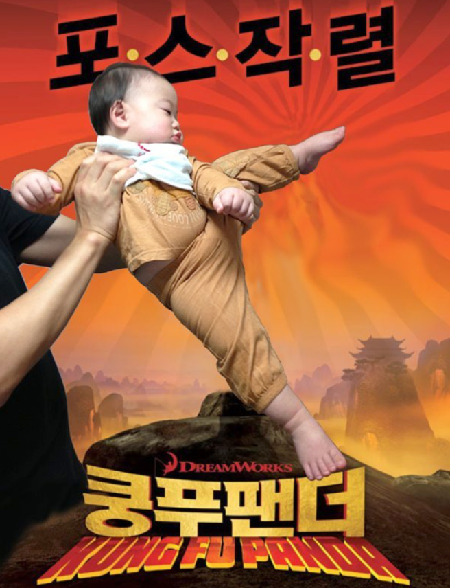 이번엔 쿵푸팬더다! 날렵한 옆차기를 하는 어릴 적 만세 사진과 아빠 송일국의 포토샵 실력 덕분에 ‘만세 팬더’ 포스터가 완성됐다. 귀엽게 발 끝 세운 것 좀 보소.