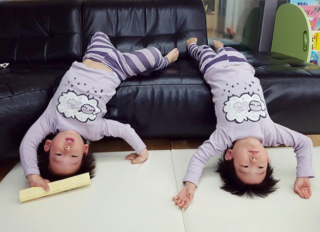 휘재댁 쌍둥이들의 스트레칭! 매일 아침마다 저렇게 몸을 늘려주면 상쾌한 하루를 시작할 수 있겠다. 굽은 척추를 교정하고 옆구리 속 근육까지 강화할 수 있을 것. (그런데 누가 서준이고 서언이죠? 뒤집어져 있어 헷갈리는 1인.)