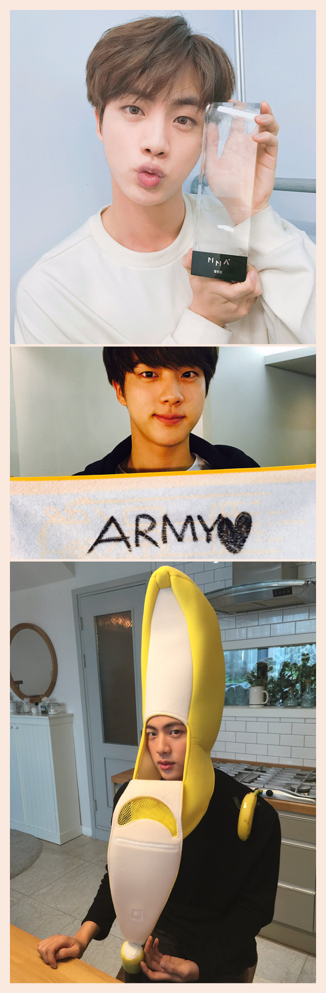 짙은 눈썹, 뽀얀 피부, 도톰한 입술 그리고 태평양처럼 넓은 진의 어깨를 보고 있으면 '오빠'라는 말이 입 밖으로 불쑥 나올 것 같다. 아름다운 영상미와 댄스가 어우러진 ‘SAVE ME’ 뮤직 비디오에서 간절한 눈빛으로 카메라를 응시할 땐 안아주고 싶었고, <아이돌 요리왕>에서 섬섬옥수 같은 손으로 칼질을 할 땐 덥석 잡고 싶다는 충동이 들었다. 진은 멤버들과 있을 때 부엌을 사수하고 요리하는 다정한 남자라고. 동생들에게 귀여운 구박을 당해도 항상 웃고만 있는 맘 좋은 막내 같은 맏형인 그를 이제 정글에서 볼 수 있다니 행복할 따름. 인도네시아 술라웨시에서 만나요~