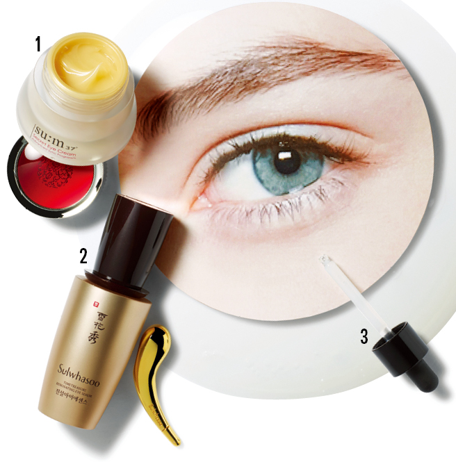 속눈썹 뿌리 부분부터 관자놀이까지 넓게 펴 바르는 것이 방법. 부기와 다크서클을 완화해 또랑또랑한 생기를 부여한다.