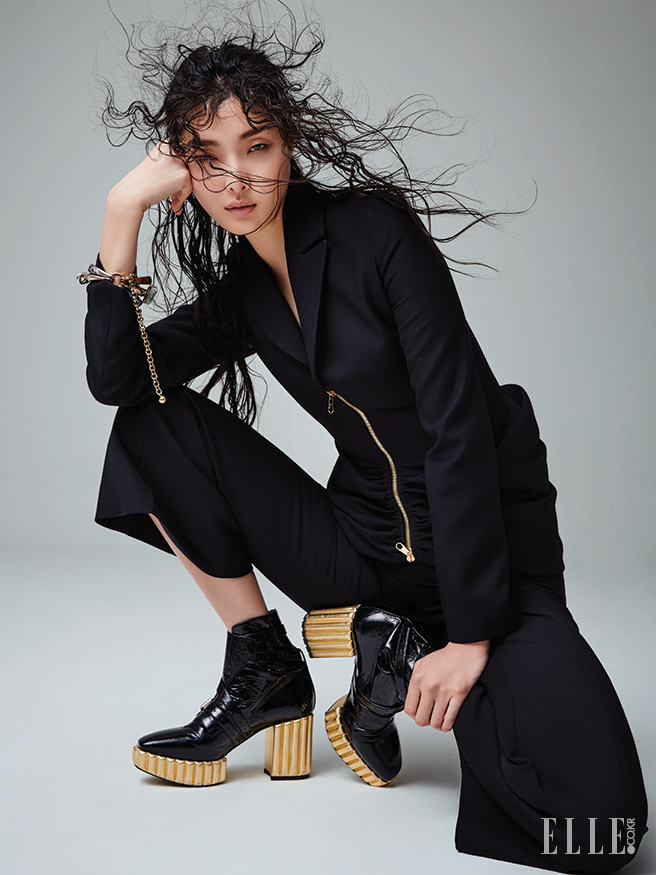 골드 지퍼 포인트의 셔링 장식 바 재킷과 블랙 팬츠, 골드 브레이슬렛은 모두 가격 미정, 앵클부츠는 2백만원대, 모두 Dior.