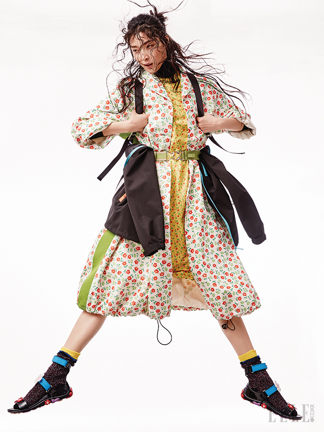 플라워 패턴의 스프링 코트와 나일론 소재의 옐로 드레스, 블랙 터틀넥, 허리에 장식한 후디드 점퍼, 니트 양말과 플라워 모티프의 샌들, 백팩은 모두 가격 미정, Prada.
