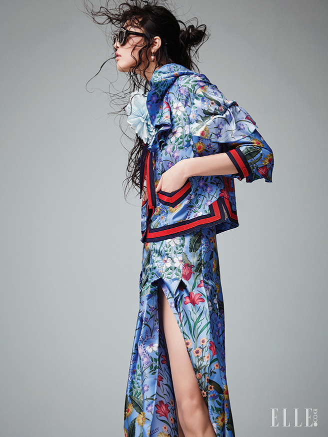 테이핑 장식의 실크 재킷은 4백33만원, 슬릿 스커트는 1백98만원, 플라워 브로치는 60만원, 진주 드롭 이어링은 59만원, 크리스털 트리밍 선글라스는 93만원, 모두 Gucci.
