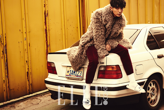 그레이 양털 코트는 Kimseoryong. 톱은 Visvim by 10 Corso Como Seoul. 벨벳 팬츠는 Pushbutton. 슬라이드는 Puma. 화이트 삭스는 American Apparel.