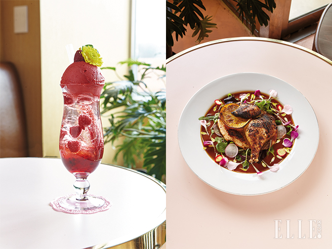 발롱 드 글라세(산딸기 히비스커스 아이스크림이 곁들여진 음료)와 오렌지 소스를 곁들인 치킨 스테이크.