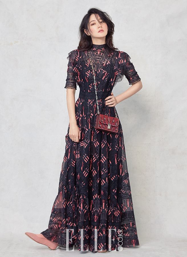 하트와 단검 모티프의 ‘러브 블레이드’ 패턴 드레스는 Valentino. 입체적인 엠브로이더리의 러브 블레이드 체인 백, 핑크 스웨이드 플랫 슈즈는 모두 Valentino Garavani.