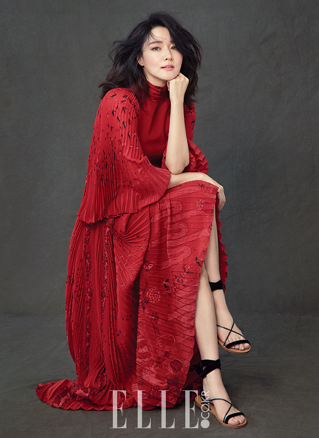 강렬한 레드 컬러의 섬세한 플리츠 롱 드레스는 Valentino. 글래디에이터 샌들은 Valentino Garavani.