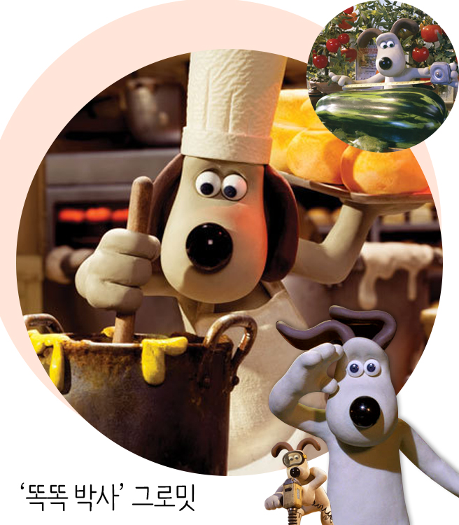 스톱모션 클레이 애니메이션 <월레스와 그로밋>의 강아지 그로밋. 감정을 표현하는 귀와 동그란 눈의 귀요미. 수학, 과학, 요리 등 웬만한 사람보다 더 많은 재주를 가지고 있는 똑똑한 재간둥이.
