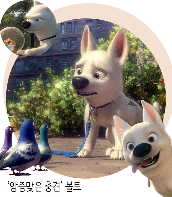 자신을 ‘파워 액션 슈퍼독’이라고 믿는 TV 스타 강아지. 몸집은 작지만 주인에게 충성하는 믿음직한 흰둥이. 때론 내 품에 안긴 아기 같고, 때론 힘이 되는 친구 같은 볼트.