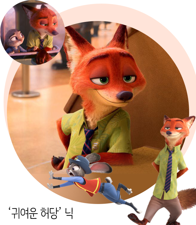 <주토피아>에서 능청스러운 매력을 마구 뿜어낸 허당 여우 닉. 빵빵한 정보력에 적당한 허세까지 갖췄으니 고민 상담은 물론이고 재치 있는 입담으로 기분 좋은 위로까지 해줄 것 같은 예감.