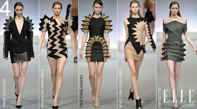 4 DAVID COMA 2009년 세인트 마틴 MA를 졸업한 24세의 데이비드 코마는 이번이 두 번째 컬렉션. 구조적인 보디컨셔스 드레스에 메탈 튜브와 멀티 컬러 체인을 장식한 디자인으로 2007년 베스트 우먼스웨어 어워드, 2009년 해러즈 디자인 어워드에서 우승했다. 그의 시그너처 스타일은 구조적인 셰이프, 무거운 장식, 완벽한 핏. 얼마 전에는 셸리 콜과 비욘세가 그의 2010 S/S 컬렉션 의상을 입고 나와 화제가 됐다. 또 메간 폭스, 레이디 가가도 그의 의상을 입었다! 여성의 보디라인에 관심이 많은 데이비드 코마는 이번 시즌 보디컨셔스 드레스에 지퍼를 여러 겹 겹쳐 코뿔소의 뿔처럼 어깨에 뾰족하게 세우고, 스커트 옆 라인에 붙인 드레스와 핑킹 가위로 가죽을 자른 듯한 지그재그 형태의 가죽을 이어붙인 드레스를 선보였다. 웨어러블한 디자인을 주로 선보였던 런던 디자이너들의 컬렉션 속에서 데이비드 코마의 과감한 컬렉션은 충분히 신선했다.