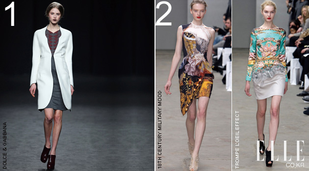 3 MARY KATRANTZOU 그리스 출신의 마리 카트란주는 런던에서 세 번의 컬렉션을 치렀다. 국내에 잘 알려지지 않았는데 2ne1의 박봄이 입었던 향수병 프린트의 드레스가 바로 그녀가 2009년 F/W 컬렉션에서 선보였던 룩이다. 세인트 마틴 대학을 졸업한 후 소피아 코코살리키에서 경력을 쌓은 그녀는 볼드하고 그래픽적인 프린트를 주로 사용한다. 커다란 네크리스 모양을 옷에 프린트해 실제로 착용한 듯한 효과를 주거나 물결무늬를 프린트해 커다란 러플이 달려 있는 것처럼 착시 현상을 주는 것이 주특기. 이번 시즌에는 견장, 훈장, 사선으로 두른 리본을 프린트해 트롱푀유 효과로 영국적인 분위기가 나는 18세기 밀리터리 무드를 표현한 아이디어가 돋보였다.
