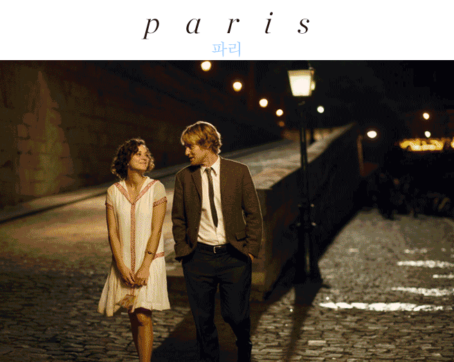 도시 이름만 들어도 왠지 로맨틱한 파리. ‘빛의 도시’란 별명답게 밤이 되면 에펠탑과 방사형으로 뻗은 거리에서 빛이 번져 나온다. 파리를 배경으로 한 사랑 영화는 정말 많지만 가장 대표적인 영화로는 <미드나잇 인 파리>를 꼽을 수 있다.