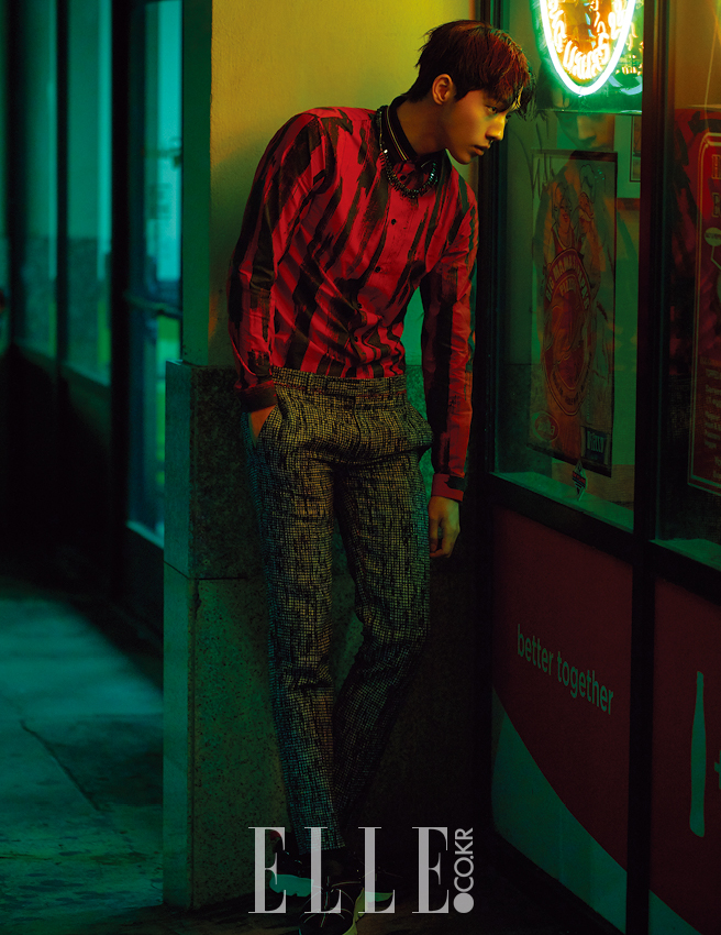 레드와 화이트 스트라이프가 돋보이는 트렌치코트는 Dior Homme. 이너 웨어로 입은 셔츠는 스타일리스트 소장품.