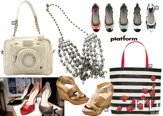 4 SOMETHING FLAT 반짝이는 광택감과 포인트 토 디자인, 말랑말랑한 셔링 디테일은 이번 시즌 플랫폼에서 소개하는 블락의 발레리나 플랫 슈즈다. 은은한 광택이 도는 파스텔 컬러는 솜사탕처럼 달콤함이 느껴지는 듯. 벚꽃이 흐드러지는 가로수길을 사뿐히 걸어보면 어떨까. 걸을 때 굽에 합성고무를 덧대어 잘 닳는 것을 방지했고 쿠션감 또한 느껴진다.