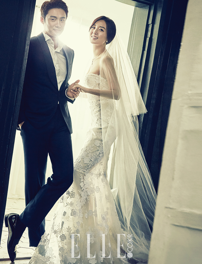오상진이 입은 재킷은 2백88만원, 셔츠 38만원, 팬츠 88만원, 모두 Canali. 레이스업 슈즈는 가격 미정, Christian Louboutin. 김소영이 입은 플라워 레이스 장식의 튜브 드레스는 Mira Zwillinger by Soyoo Bridal. 베일은 Atelier Ku. 화이트골드 소재에 다이아몬드 세팅 이어링은 5백만원대, 화이트골드에 전체를 다이아몬드로 세팅한 네크리스는 8백만원대, 모두 Bulgari.