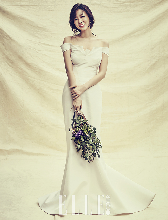 김소영이 입은 머메이드 라인이 돋보이는 오프숄더 드레스는 Zac Posen by Atelier Ku. 이어링은 33만원, Tani by Minetani. 모던한 뱅글은 1백80만원, Ginette NY. 부케는 S Flora.