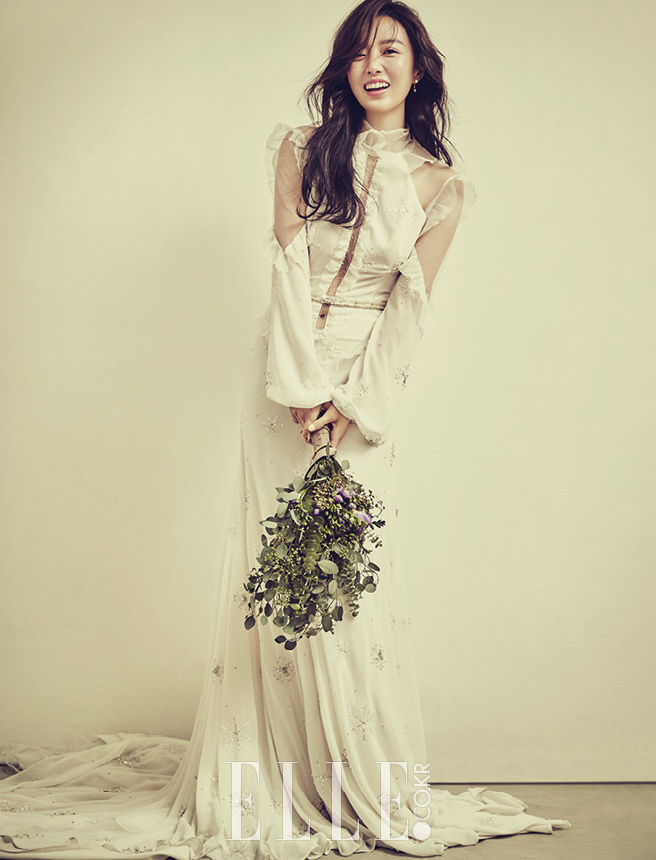 결혼 준비 과정에 대한 환상은 없나요 예전엔 성대한 결혼식을, 요즘은 시대를 반영한 소박한 결혼식을 많이 하는데, 크거나 작은 거보다 그냥 남들이 하는 걸 똑같이 하는 건 안 하고 싶은 정도예요. 대신 사진에 대한 기대는 있었어요! 연애하면서 사진 찍은 적이 한두 번도 안 돼서 먼 훗날에 봐도 보기 좋은 사진이 있으면 했어요. 결혼에 관한 다른 모든 건 어물쩍거리며 답했는데 <엘르 브라이드> 화보만큼은 확실하게 좋다고 했죠! 오상진 씨가 부정형으로 “이런 게 있는데 못하겠지?”라고 물었는데 제가 하자고 해서 놀랐대요(웃음).