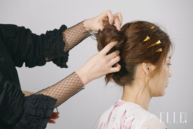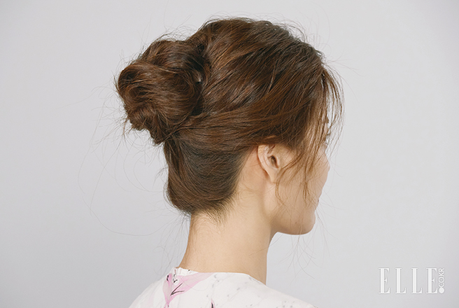 가벼운 제형의 워터 헤어스프레이를 전체적으로 한 번 뿌리면 자연스러운 미디엄 업 스타일이 완성된다.