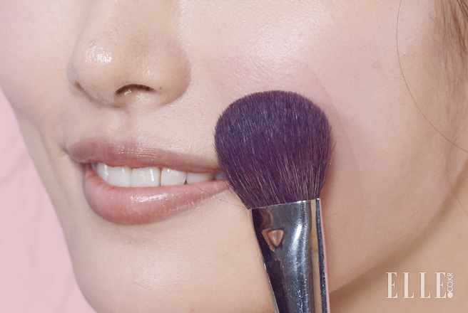 보랏빛이 감도는 핑크 컬러를 선택해 광대 밑부터 볼 전체를 가볍게 쓸어준다.