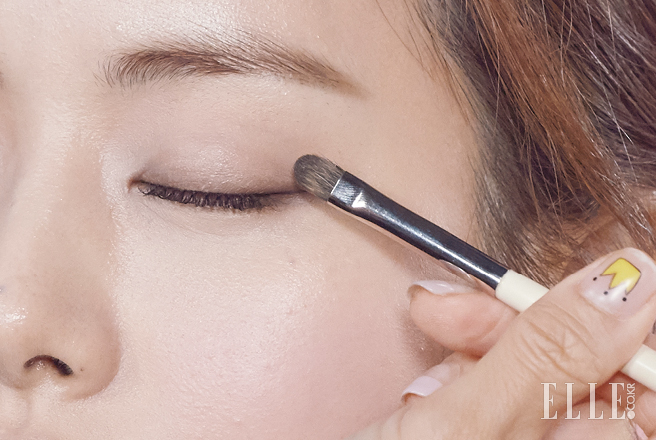 눈매가 길어 보이도록 아이라인을 일자로 그려준다. 연한 브라운 컬러로 라인 위에 자연스럽게 블렌딩해 마무리.