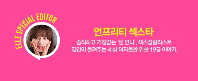 한국 나이 35세. 언제나 연애 중인 ‘연쇄 사랑마’. 예수님 믿으면 천국 가고 언니 믿으면 홍콩 간다. 여러분의 성진국 언니, 본인의 경험을 토대로 한 솔직한 글로 공감을 이끌어 내는 문학하는 언니 입니다. 그대들을 위해서라면 흑역사 공개도 두렵지 않은 언프리티 섹스타 김얀의 이야기는 elle.co.kr 에서 격주 수요일 찾아 갑니다.