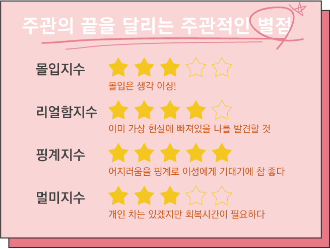 기존의 놀이기구에 무뎌진 이들, VR을 제대로 체험해보고픈 VR초짜 혹은 이성에게 기댈 핑계를 원하는 이들에게 추천한다.