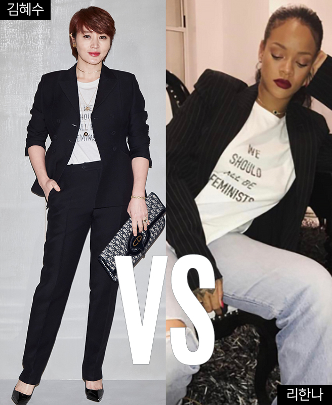 ‘WE SHOULD ALL BE FEMINISTS(우리는 모두 페미니스트가 되어야 합니다)’ 작가 치마만다 은고지 아디치에의 에세이 제목에서 따온 문구로 이번 시즌 돌풍을 몰고 온 디올의 티셔츠. 김혜수와 리한나는 마치 약속이라도 한 듯 티셔츠 위에 블랙 블레이저를 매치해 그 누구보다 파워풀함을 뽐냈다.