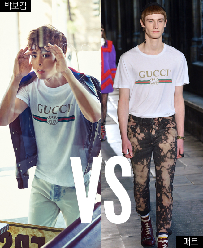우유 빛깔 소년들이 선택한 구찌의 빈티지풍 티셔츠. 그 이름만으로도 설레게 만드는 박보검과 모델 매트(Matt)는 빈티지 로고가 새겨진 화이트 티셔츠를 입고 <엘르>의 12월호 화보와 런웨이에 모습을 드러냈다. 박보검은 매트와 다르게 어깨에 슬쩍 블루종을 걸쳐 새로운 스타일을 선보였다.