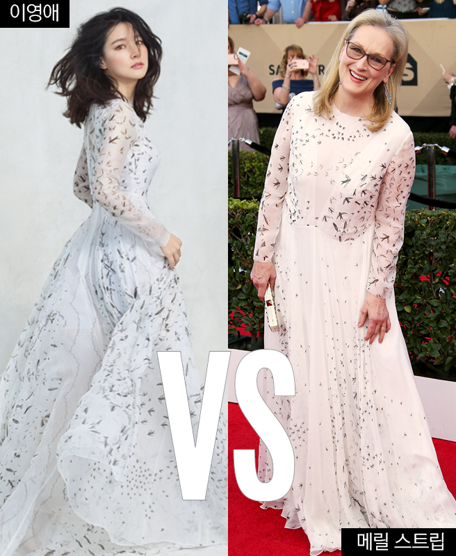 순백의 롱 드레스 대결! 이영애는 <엘르>의 2월호 화보에서, 메릴 스트립은 SAG 어워드에서 발렌티노의 같은 드레스를 선택. 이영애는 새하얀 피부와 어우러져 여신 포스를, 메릴 스트립은 레드 카펫 스타일에서 잘 선택하지 않는 안경을 매치해 지적인 이미지를 선보였다.