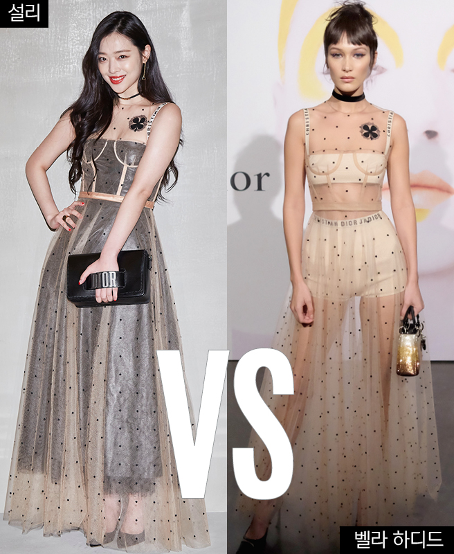 요즘 ‘떴다’ 하면 ‘핫’ 이슈를 몰고 다니는 설리와 톱 모델 벨라 하디드. 아무나! 쉽게! 입을 수 없는 디올의 시어한 드레스를 전혀 다른 느낌으로 연출했다. 벨라는 톱 모델답게 브라 톱과 브리프 위에 과감한 스타일링을, 설리는 블랙 튜브 드레스 위에 레이어드해 스타일 감각을 뽐냈다.