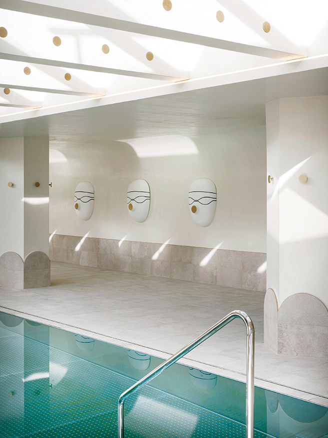 수영장 벽면에 하이메 아욘이 디자인한 마스크 오브제가 눈에 띈다.