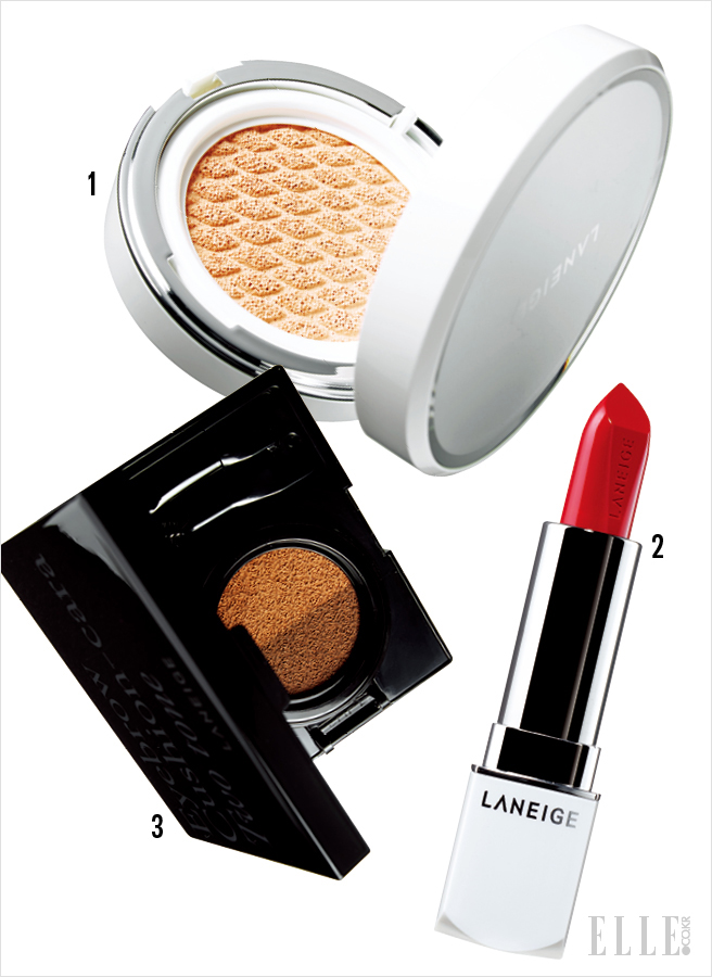 F/W 시즌의 전유물이라고 여겨지던 레드 립. 맑고 촉촉한 느낌의 레드라면 S/S 시즌에도 문제없다. 비비쿠션_화이트닝, 13C 쿨 아이보리를 가볍게 두드려 발라 피부 표현이 너무 두꺼워지지 않도록 한다. 세련되고 담백한 레드 립 메이크업을 위해 지나친 아이 메이크업은 생략. 대신 아이브로를 강조할 것. 사용 제품은 아이브로우 쿠션-카라, 2호 투 톤 브라운. 풀 립(Full Lip) 표현을 위해 실크 인텐스 립스틱, 335 겟 더 레드를 브러시에 묻혀 외곽 선부터 정교하게 바르는 것으로 마무리. 사용 제품은 모두 Laneige.