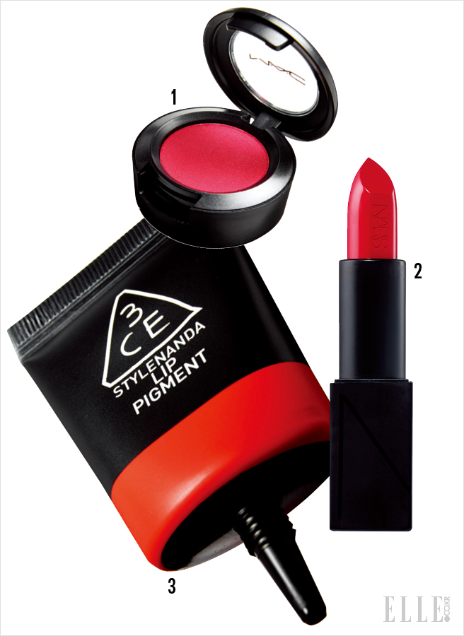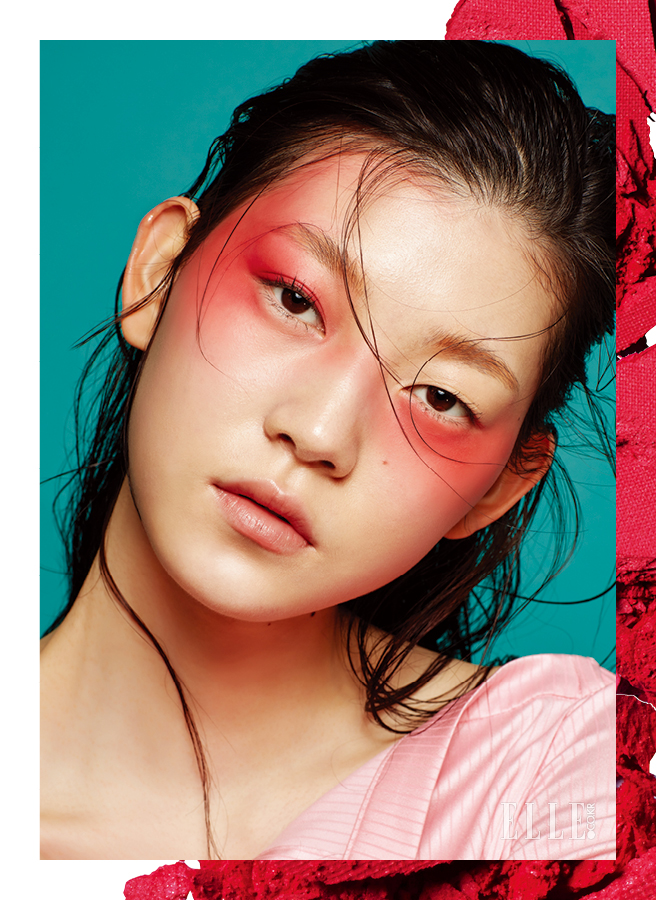 “넌 취했을 때 제일 예뻐!” 대담하고 신비로운 볼 빨간 메이크업. 붉은 얼굴은 MAC 파우더 블러쉬, 네버 세이 네버를 눈가와 양 볼, 헤어 라인까지 넓게 물들인 다음 Nars 어데이셔스 립스틱, 그레이스와 3CE 립 피그먼트, 이슈를 눈 가까이에 덧발라 선명함을 더했다. 아이라인은 과감히 생략, 대신 속눈썹에 Innisfree 스키니 꼼꼼 카라, 1호 블랙을 가볍게 터치해 강약을 조절. 입술은 Estee Lauder 뉴트리셔스 바이탈리티 8 래디언트 립 트리트먼트로 맨 입술처럼 자연스러운 핑크빛을 부여했다.