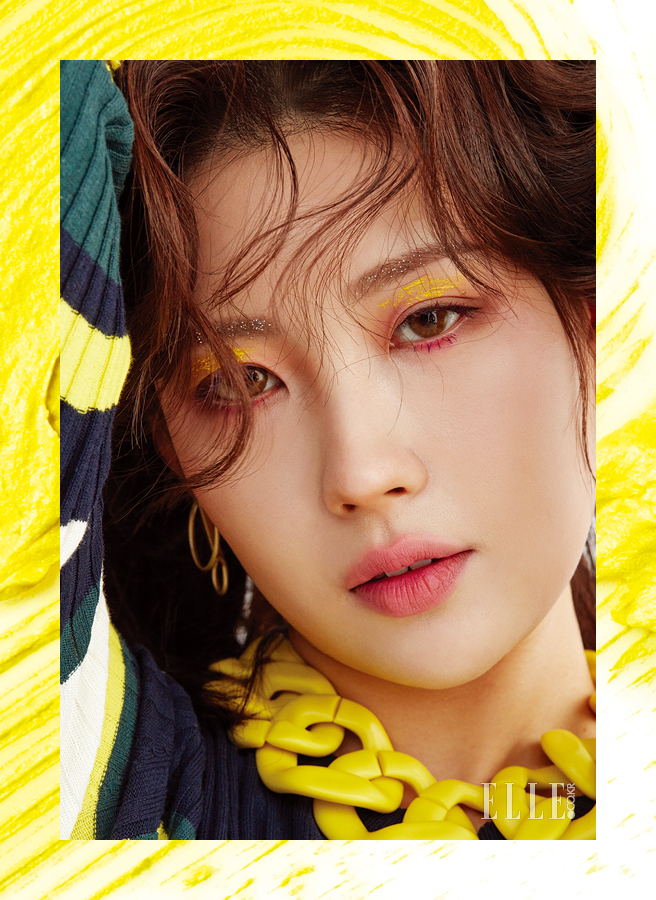 니트 톱은 A. T. Corner. 체인 디테일의 옐로 네크리스는 H&M. 골드 이어링은 Pilgrim.