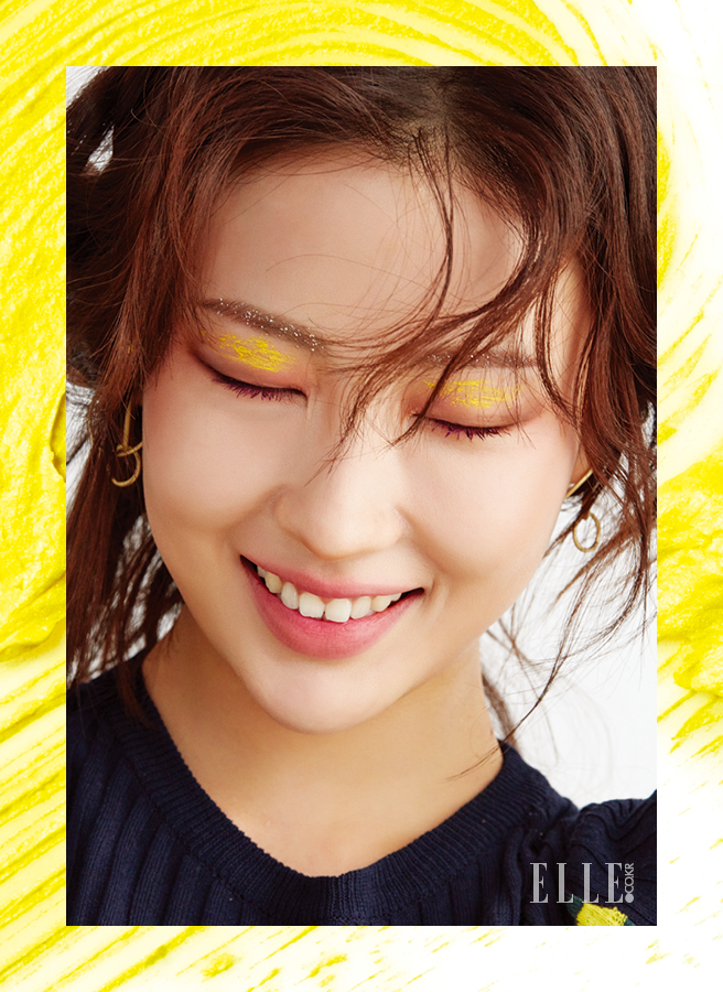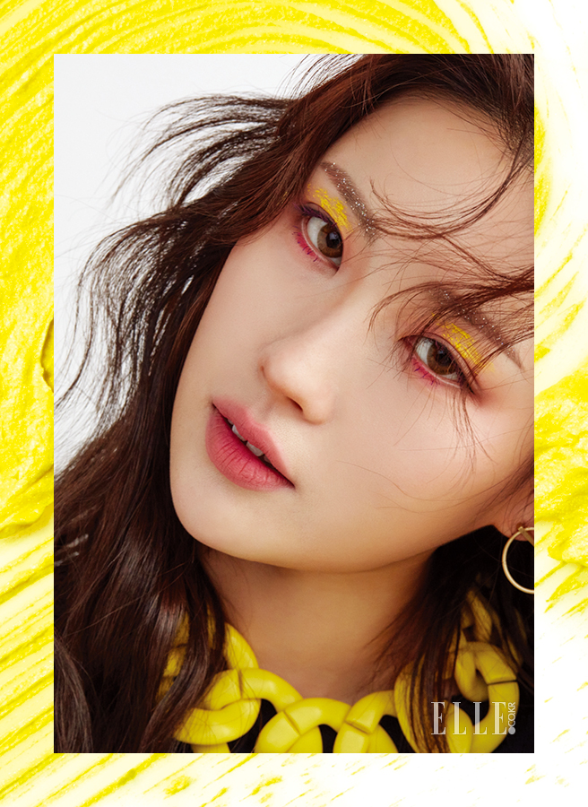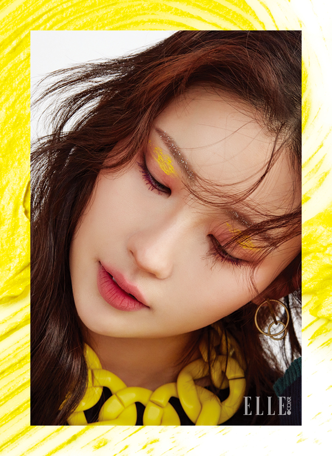 얼굴에 드리운 컬러플 메이크업. 정해진 규칙은 없으니 자유롭게 놀아볼 것. 반짝이는 눈썹은 투명한 Etude House 오 마이 래쉬 마스카라, 1호 톱 코트와 네일 글리터를 활용, 눈썹에 콩콩 찍어 얹어주었다. 다채로운 눈매는 MAC 파우더 블러쉬, 브라이트 핑크로 은은하게 물들인 다음 선명한 핑크 컬러의 Nars 벨벳 립 라이너, 코스타 스메랄다를 언더라인 중앙에 발라 동그란 눈매를 강조한 것. 눈두덩은 눈이 시린 옐로 컬러의 MAC 인 익스트림 디멘션 래쉬, 에너자이즈드를 문질러 거칠게 연출했다. 보랏빛 속눈썹은 MAC 인 익스트림 디멘션 래쉬, 쿨 다운을 어퍼 래시와 언더 래시 중앙에 발라 위트 있게 마무리.