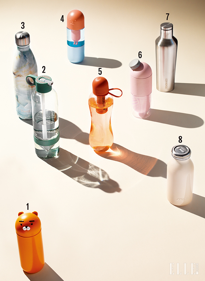 8 마치 파트라슈가 배달하던 우유병처럼 앙증맞은 모양새의 텀블러. 크기는 작지만 입구가 넓어 얼음을 넣는 데도 문제없다. 보틀 내외부 사이에 진공 층이 있어 뜨겁거나 차가운 음료를 담아도 쉬이 뜨거워지거나 물방울이 맺히지 않는 것도 매력. 350ml 3만2천원, Mosh.