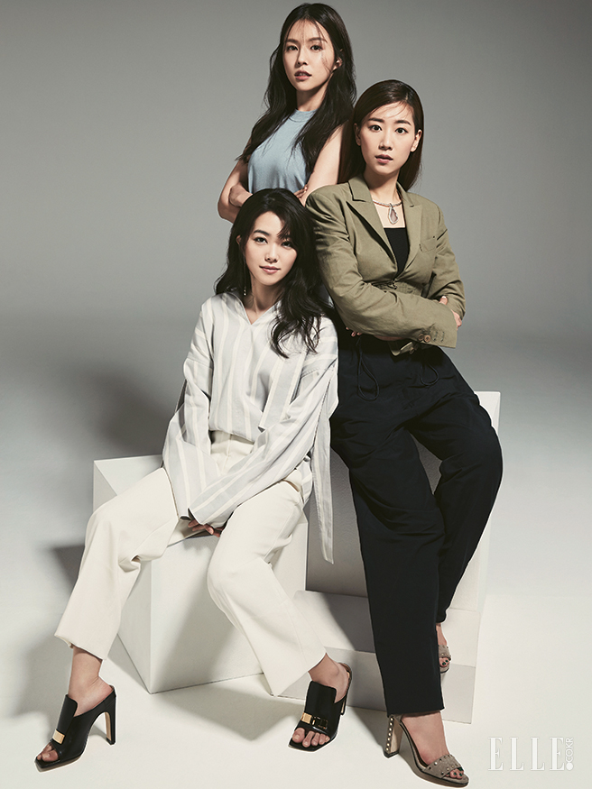 조수애가 입은 슬리브리스 니트는 모두 COS. 실버 브레이슬렛은 Mzuu. 송민교가 입은 카키 컬러의 코르셋 재킷과 러플 디테일의 배기 팬츠는 모두 Stella McCartney. 스터드 장식의 스트랩 슈즈는 Jimmy Choo. 스톤 펜던트 네크리스는 Pilgrim. 강지영이 입은 오버사이즈 스트라이프 블라우스는 Joseph. 화이트 팬츠는 Each×other. 골드 장식의 뮬은 Sergio Rossi. 실버 이어링은 Mzuu.